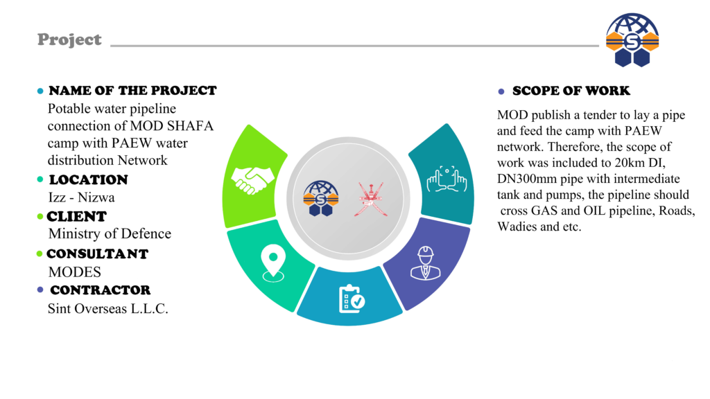 * 600mm Boring in 5 places, asphalt cutting, wadies, OGC & PDO pipeline crossing and etc.