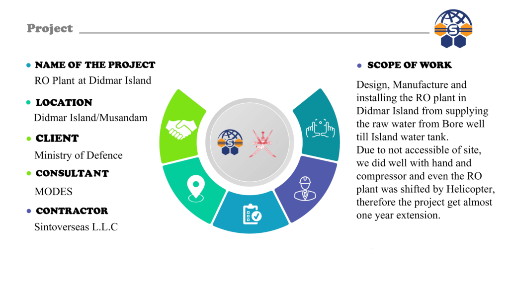 Supply, and installation of 15 M3/day RO plant, with all the accessories. Bore well (hand excavation), pump and all the accessories. GRP tank for row water, intake and product water. Pipe laying from borewell to RO plant and Island storage tank.